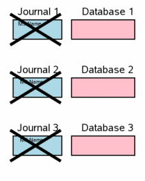 When multiple database files are involved in a transaction, each database has its own rollback journal and each database is locked separately. The diagram at the right shows a scenario where three different database files have been modified within one transaction. The situation at this step is analogous to the single-file transaction scenario at step 3.6. Each database file has a reserved lock. For each database, the original content of pages that are being changed have been written into the rollback journal for that database, but the content of the journals have not yet been flushed to disk. No changes have been made to the database file itself yet, though presumably there are changes being held in user memory.